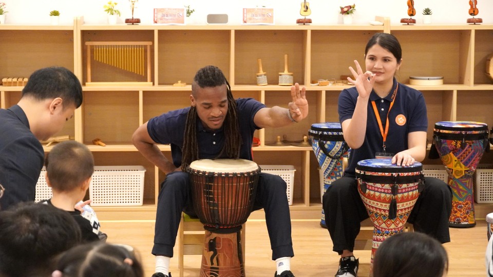Stepping into the Pui Kiu music room felt like entering a space designed for sound and exploration. Triangles, hand drums, xylophones, shakers, and other instruments were available for children to discover. Here, music is not only listened to, but actively explored. With gentle guidance from teachers, children freely experimented with rhythm and sound. The steady beats of drums and the soft sounds of shakers came together into simple, shared rhythms. Seated in a circle, children followed the teacher's beat as they played African drums together. Simple rhythms gradually developed into flowing patterns, with moments of concentration and bursts of laughter. Here, music became both play and dialogue—an experience of listening and self-expression.