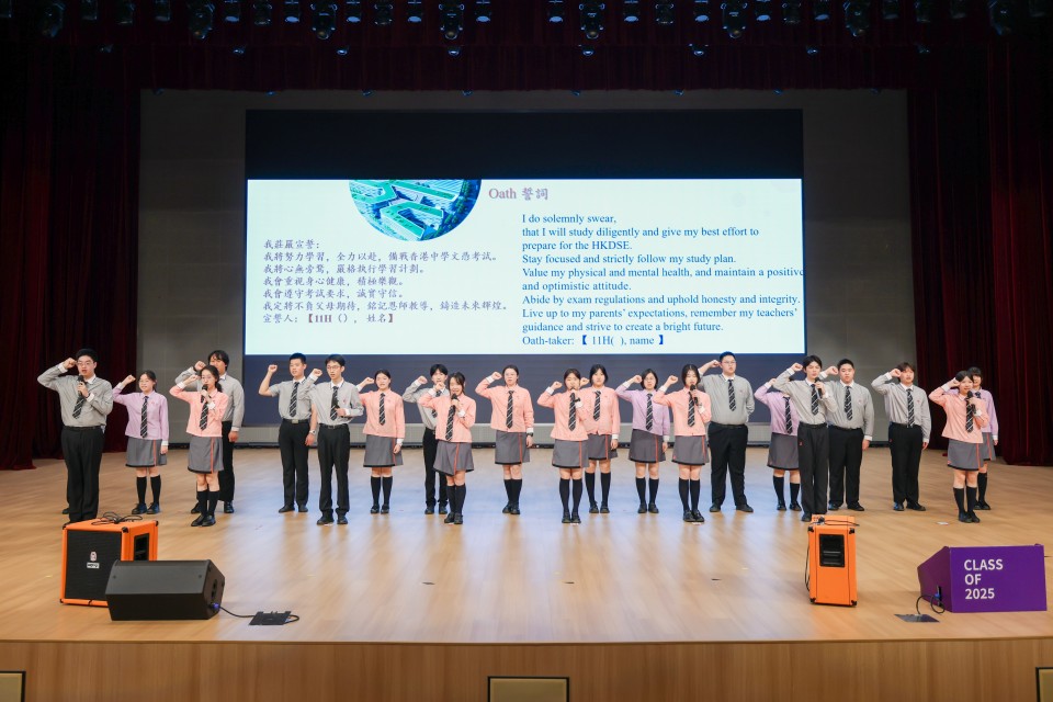 The ceremony reached a highlight as the Grade 11 students stood and raised their right fists to take the oath in the presence of teachers and students. In firm and resonant voices, they pledged to approach their DSE preparation with dedication and determination, giving their very best in pursuit of their goals. The solemn oath echoed throughout the theatre, reflecting their courage to embrace challenges and carry forward the spirit of perseverance.