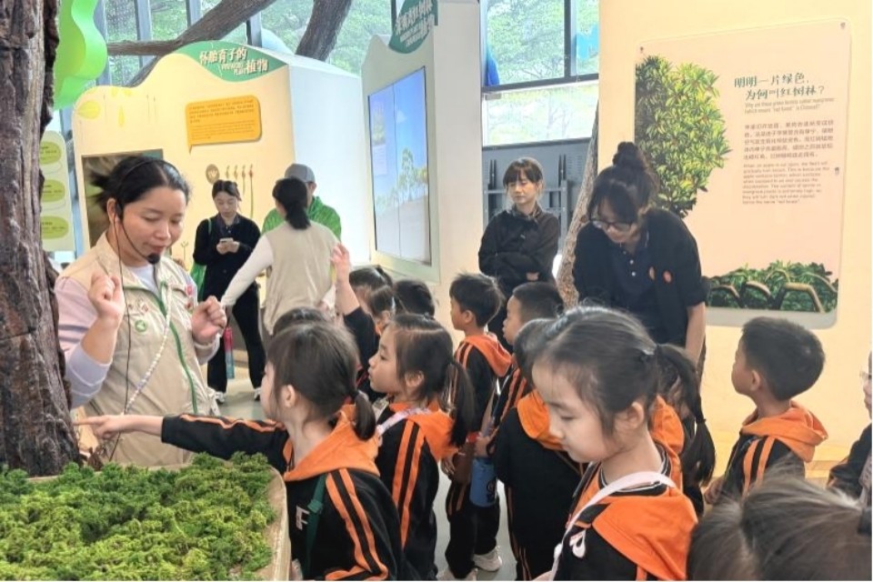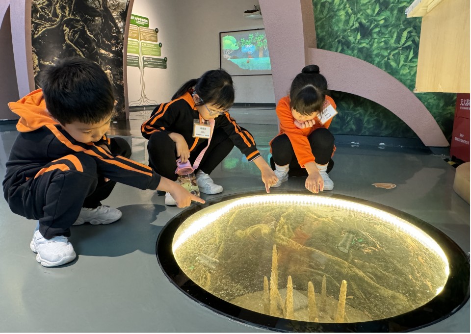 Here, we found "breathing roots"! The roots poke out of the ground like little antennas, and the children were invited to touch them: "This is the mangrove's 'breathing pipe'. Thanks to these roots, the leaves and trunks don't mind being submerged in water!" There's also an interactive screen showing how mangrove leaves change through the seasons—bright green in spring, deep green in summer, and still green in autumn, thanks to their "waterproof coats" (a leathery surface that locks in moisture).
