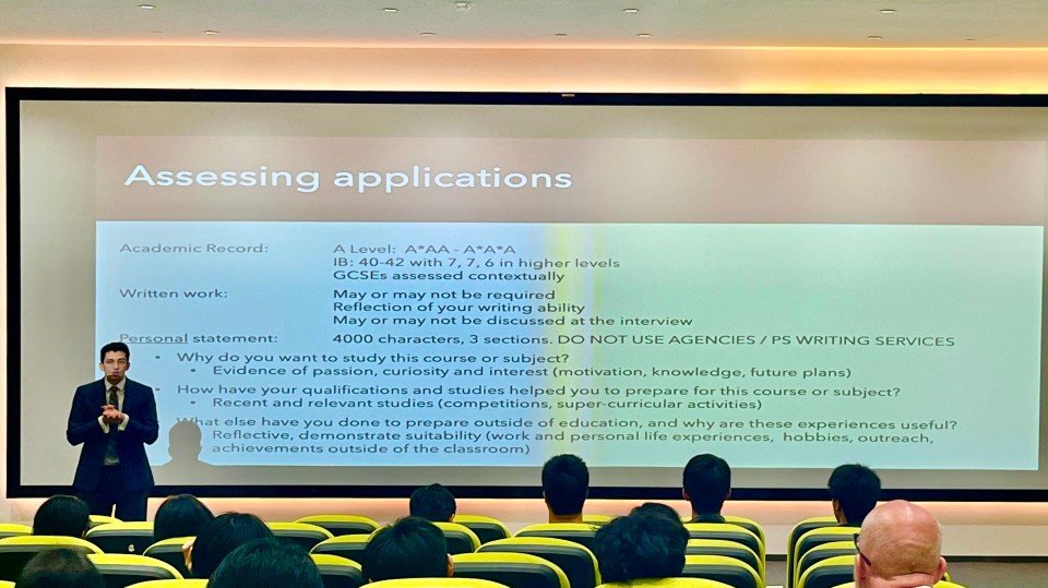 Dr. Peter Bolgar broke down the application process into eight essential steps. These range from choosing courses and colleges based on personal interests, to submitting application materials, taking entrance exams, and attending interviews (in 2025, most interviews will be conducted online; with about 75% of students receiving interview invitations. Each interview will consist of 20 to 25 minutes of academic discussion. Students are expected to be well-prepared, with a solid understanding of their personal statement and subject knowledge). He stressed that every step is essential, forming a complete chain for evaluating an applicant's overall strengths. From an interviewer's perspective, he noted that interviews are fundamentally academic conversations designed to reveal a student's thinking process and analytical ability. He therefore encouraged students not only to master subject content but also to practise articulating their thought processes clearly, especially when discussing academic experiences referenced in their personal statements.