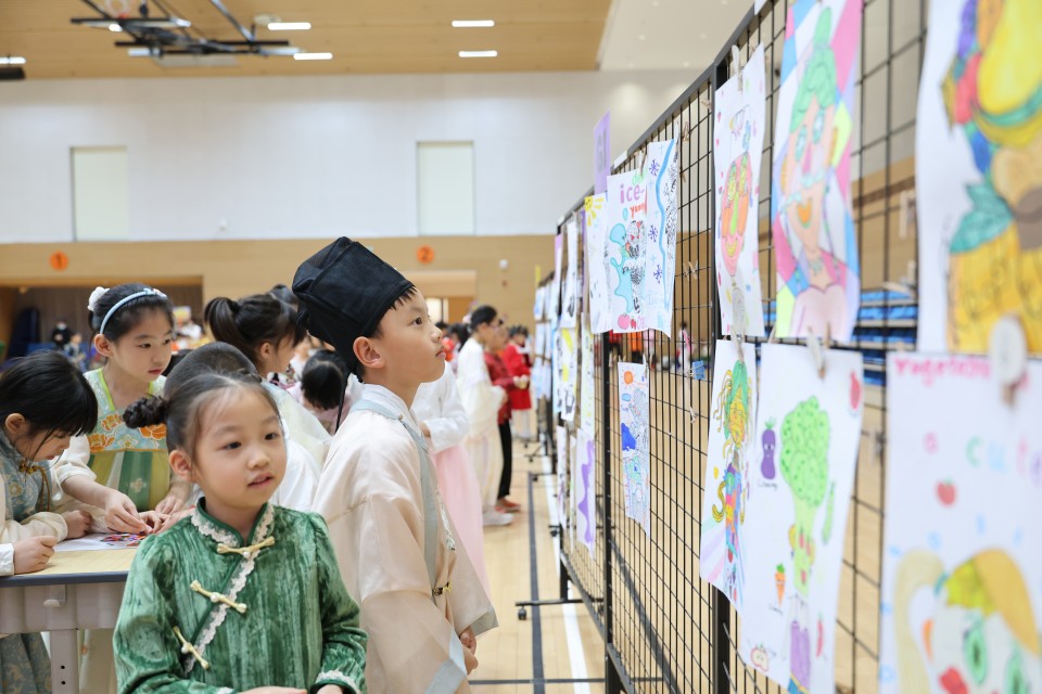 室內籃球場變身藝術長廊,展出來自各年級學生書畫、剪紙、手工藝作品,吸引眾人駐足欣賞。