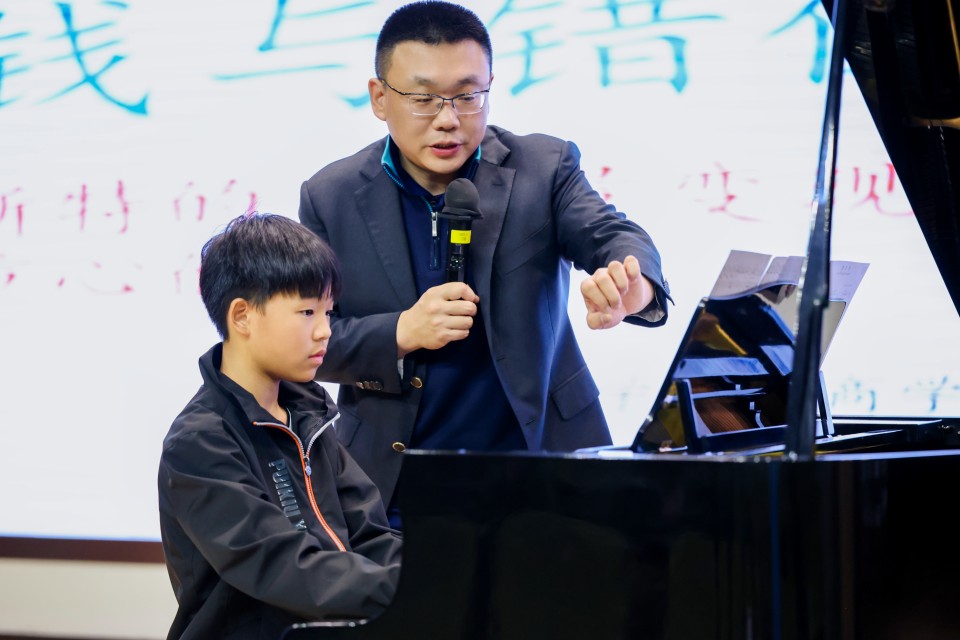 在講座的互動環節,學生們展現出了極高的熱情和參與度。湯教授對7年級的何同學的演奏進行現場指導,指導何同學在演奏時要突出旋律與反差的部份,對何同學的演奏給予了鼓勵以及肯定。