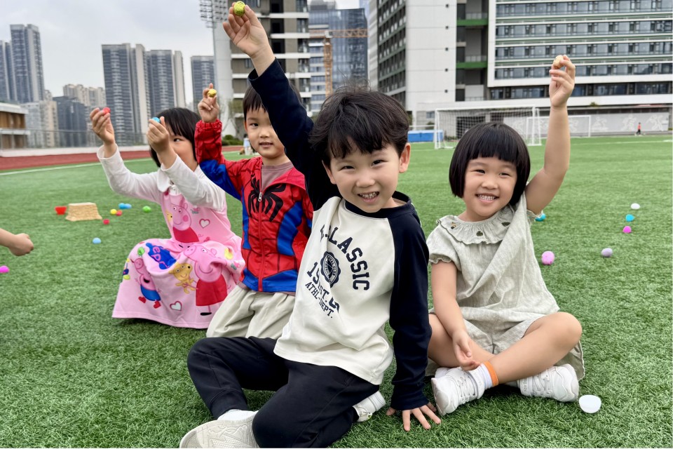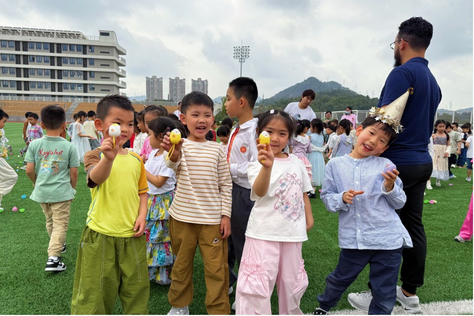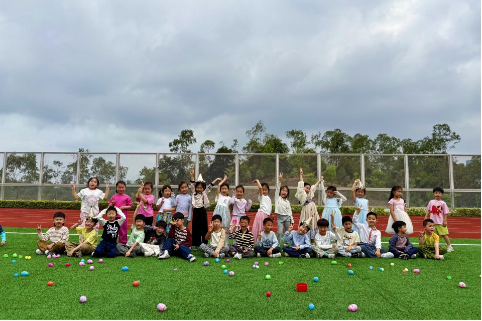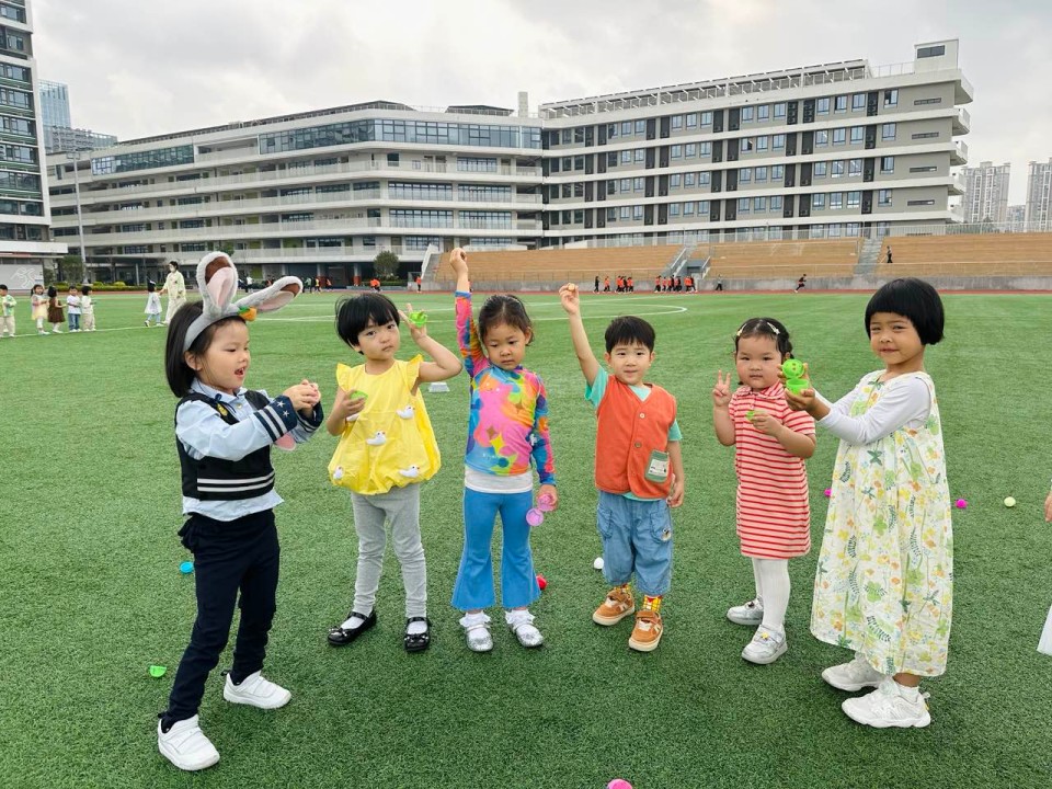 書院的足球場,瞬間變身為巨型尋寶樂園!翠綠的草坪、嬌嫩的灌木、細嫩的枝頭,到處都藏著彩蛋的身影。它們五彩繽紛,閃閃發光,猶如散落的寶石,等待著小小探險家們去發掘。