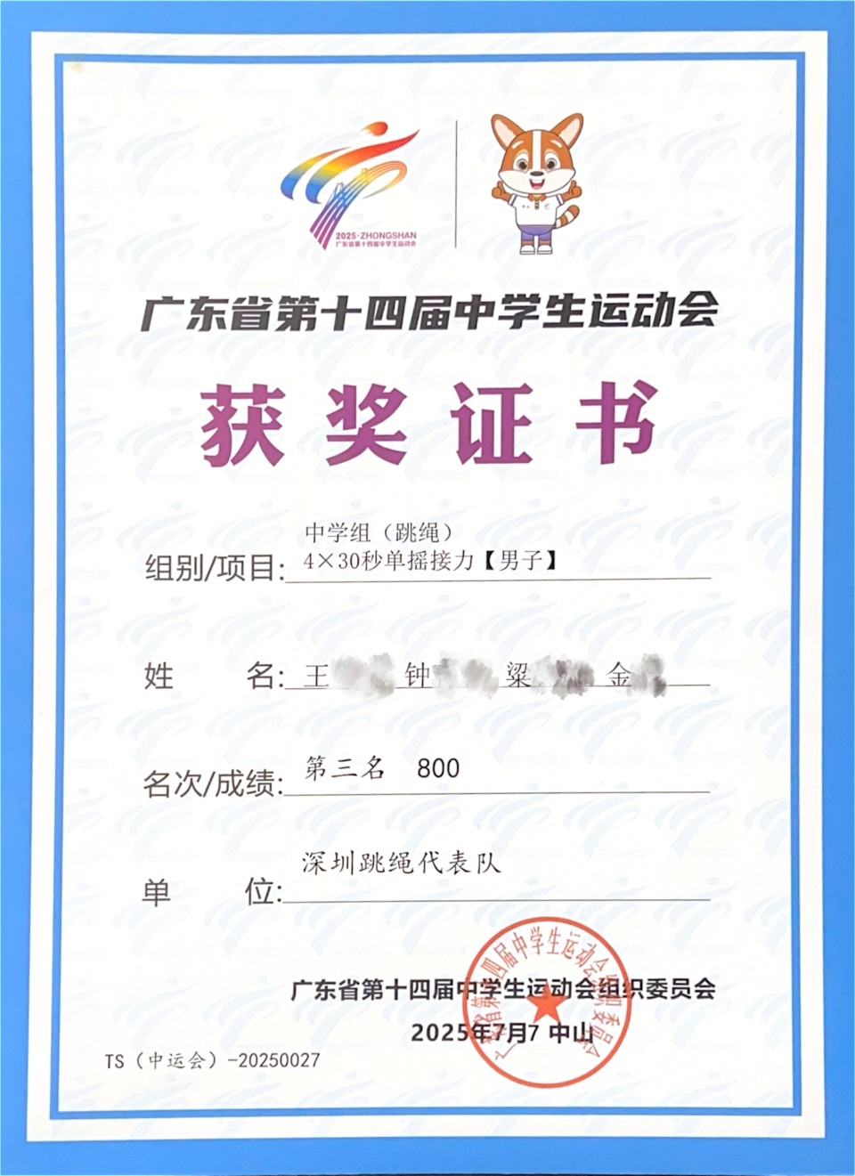 钟同学 中学组(跳绳)个人花样【男子】第八名