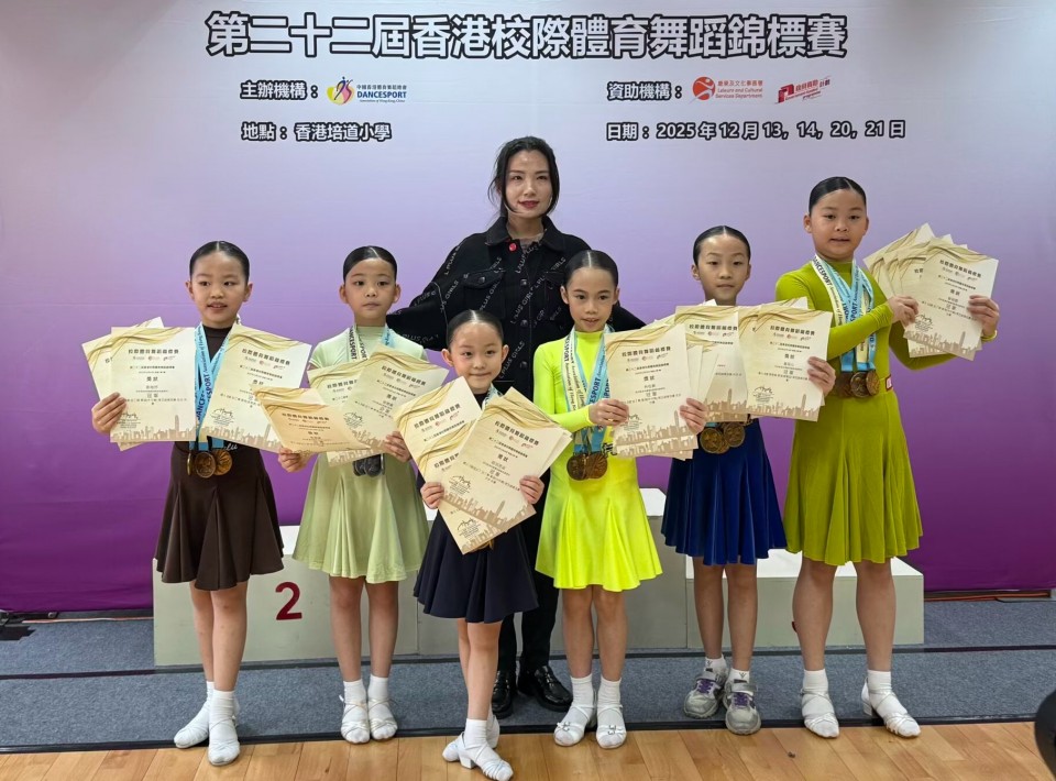 12月14日,由中国香港体育舞蹈总会主办的第二十二届香港校际体育舞蹈锦标赛-章别赛精彩开赛。我校小学部学子组团出征,共参与32项体育舞蹈赛事角逐,凭藉扎实的舞蹈功底与出色的舞台表现力,最终荣获28项冠军、4项亚军的傲人成绩。