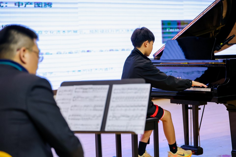 在讲座的互动环节,学生们展现出了极高的热情和参与度。汤教授对7年级的何同学的演奏进行现场指导,指导何同学在演奏时要突出旋律与反差的部份,对何同学的演奏给予了鼓励以及肯定。